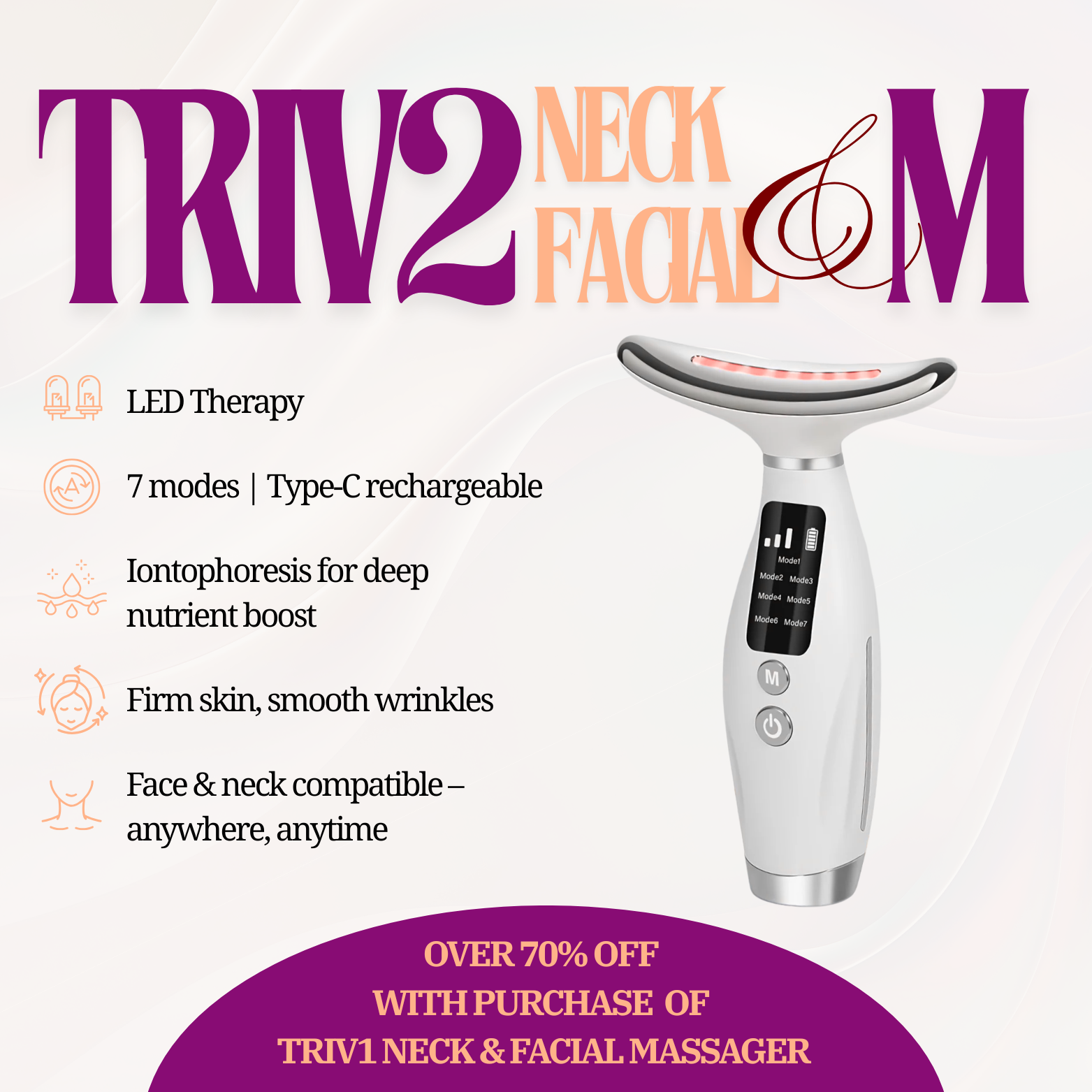 TRIV2 is designed specifically for the neck and jawline area, combining EMS microcurrent, warm massage, LED therapy, and ion cleansing. It helps reduce sagging, smooth wrinkles, and improve skin tone — all in one compact device you can use at home.